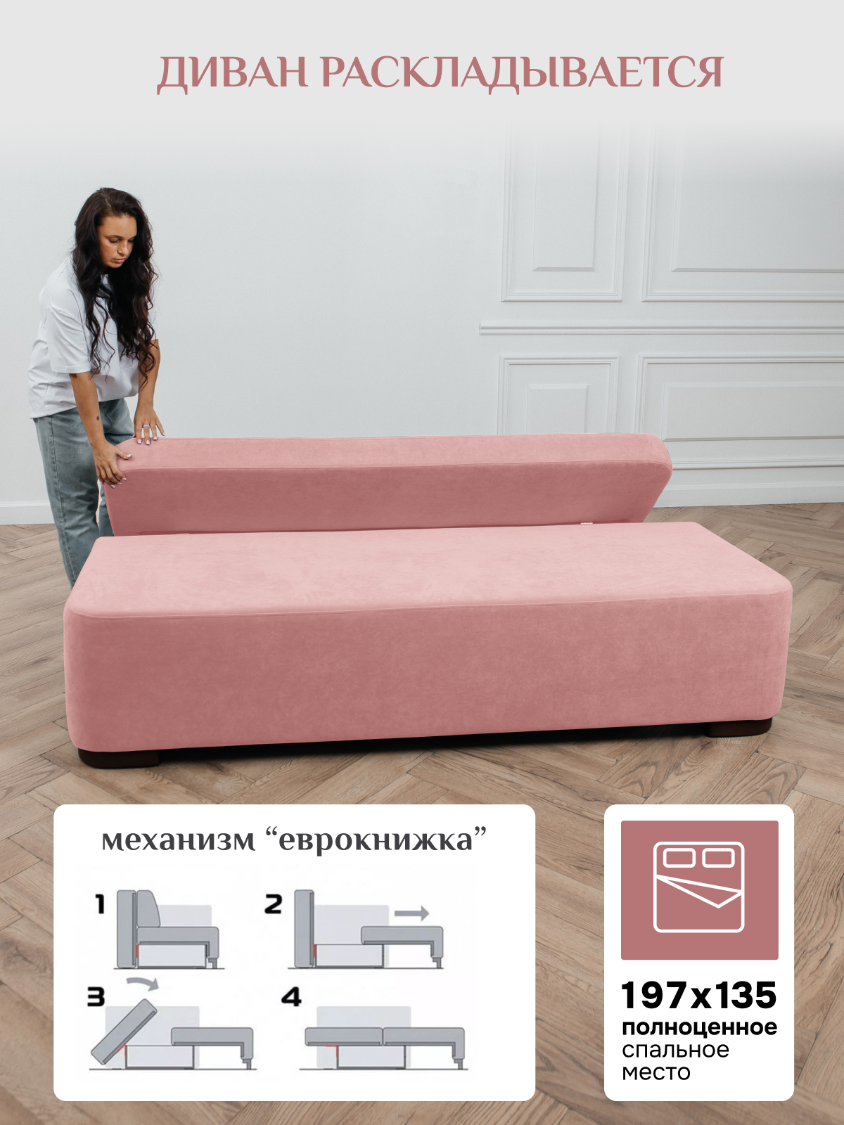 Спальное место формируется на основе механизма трансформации "Еврокнижка". Преимущества трансформации диванов Еврокнижка: Прочность. Механизм редко ломается и устроен максимально просто: сиденье нужно потянуть вперед, а на его место поставить спинку.